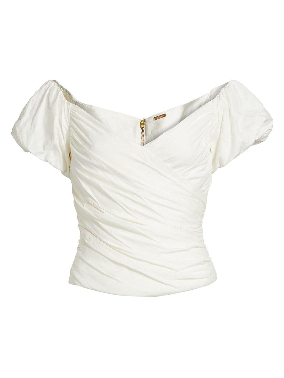 This Helene top from Cult Gaia is crafted of a linen blend and features a gathered bodice. V-neck, Vd back Short sleeves Gathered bodice Back zip closure 58% linen/40% rayon/2% spandex Dry clean Imported SIZE & FIT About 21 from shoulder to hem Model measurements: 510 tall Model is wearing a US size 4. Contemporary Sportswear - Workshop > Cult Gaia > Saks Fifth Avenue > Barneys. Cult Gaia. Color: Off White. Size: 8.