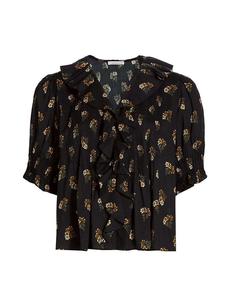 This floral Henri blouse from DEN is designed with a plunging ruffled V-neck, pintuck pleats at the bodice, and elbow-length puff sleeves. Plunging ruffled V-neck Short puff sleeves Bodice pintuck pleats Button-front closure 52% cotton/48% viscose Machine wash Imported SIZE & FIT About 22 from shoulder to hem Model measurements: 510 tall Model is wearing a US size Small. Contemporary Sportswear - Workshop > Den > Saks Fifth Avenue > Barneys. DEN. Color: Buttercup Bouquet. Size: XS.