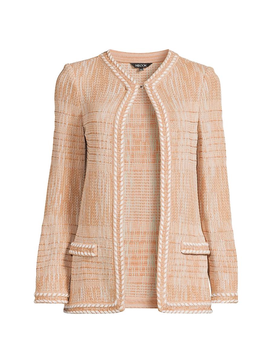 This Heritage Fit knit jacket from Misook showcases a melange design with whipstitch trim, creating a rich, multi-tonal effect. V-neck Long sleeves Hook-and-eye closure 65% acrylic/22% nylon/13% rayon Trim: 100% polyester Machine wash Imported SIZE & FIT About 26 from shoulder to hem Model measurements: 510 tall Model is wearing a US size Small. Modern Collections - Modern Coll > Misook > Saks Fifth Avenue > Barneys. Misook. Color: Baked Clay. Size: Large.