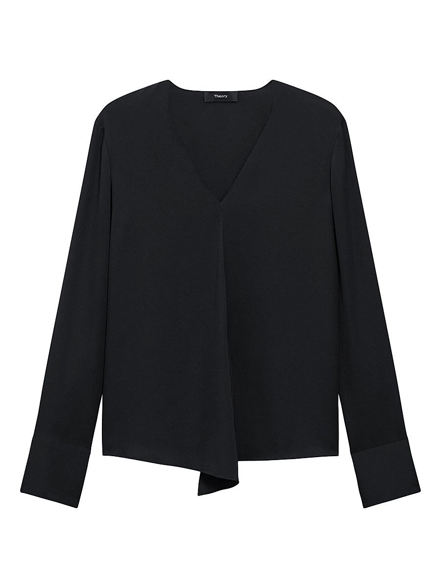Cut in a relaxed fit, this silk blouse from Theory is styled with a draped fold detail and a hidden slit at the front. Silk was independently tested and passed safety tests for the presence of harmful substances during parts of the textile formation process V-neck Long sleeves Pulls over 100% silk, exclusive of trim Dry clean Imported SIZE & FIT About 24 from shoulder to hem Model measurements: 510 tall Model is wearing a US size Small ABOUT THE BRAND In 2000, founders Andrew Rosen and Elie Tahari launched Theory with a focus on innovative, comfortable stretch pants for women. Since then, the New York-based brand has become well-known for its mastery of polished, well-tailored separates for women and men. Contemporary Sportswear - Theory Sportswear > Theory > Saks Fifth Avenue > Barneys. Theory. Color: Black. Size: XS.