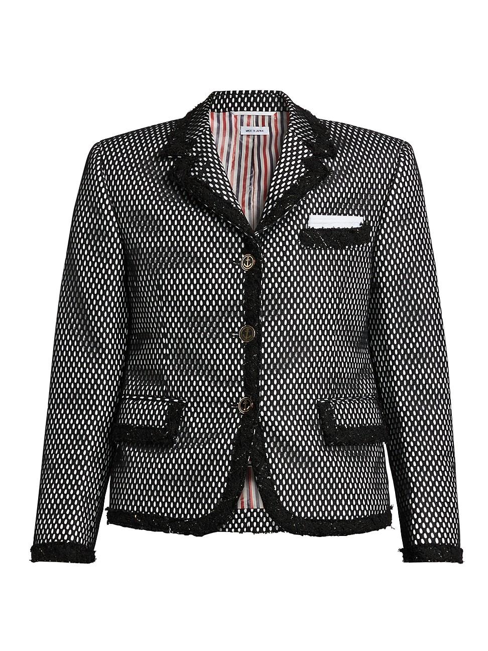 Thom Browns High Break sport coat is reimagined in athletic mesh with a camp collar, chest pocket, and two flap pockets. This jacket features sequin-embellishing throughout the contrast trim. Notch lapel Long sleeves, button cuffs Front flap pockets Chest welt pocket Front-button closure 100% polyamide Combo 1:87% polyester/8% polyamide/4% cotton/1% metallic fibers Combo 2: 100% silk Lining: 100% cupro Dry clean Made in Italy SIZE & FIT Model measurements: 510 tall Model is wearing a US size 4. Advanced Designer - Designer Emerging Brands > Thom Browne > Saks Fifth Avenue > Barneys. Thom Browne. Color: Black. Size: 6.