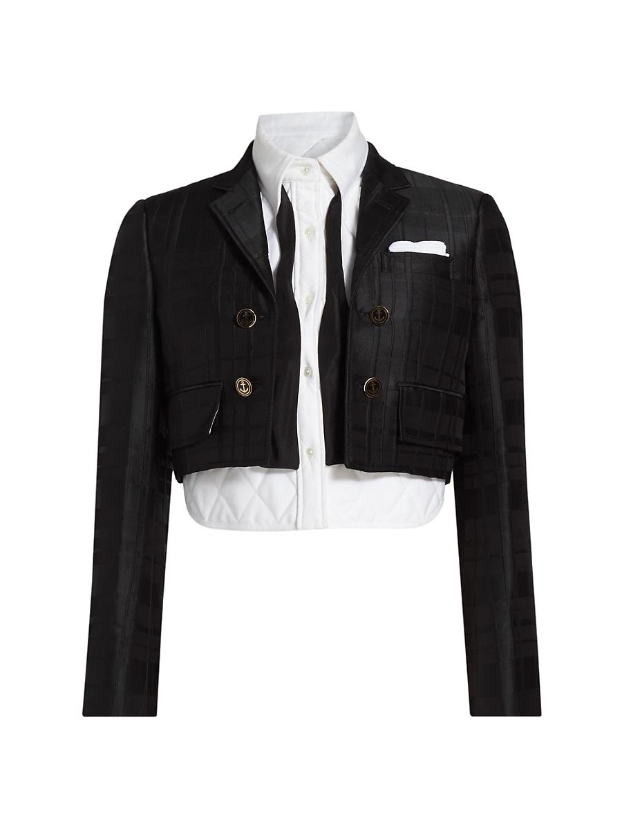 Thom Browns High Break boasts a two-in-one cropped design, featuring a cotton Oxford shirt layered under a windowpane jaquard sport coat-inspired jacket. Peak collar, notch lapel Front flap pockets Chest welt pocket Button-front closure 80% polyester/20% silk Combo: 100% cotton Lining: 100% cupro Dry clean Made in Italy SIZE & FIT Model measurements: 510 tall Model is wearing a US size 4. Advanced Designer - Designer Emerging Brands > Thom Browne > Saks Fifth Avenue > Barneys. Thom Browne. Color: Black. Size: 6.