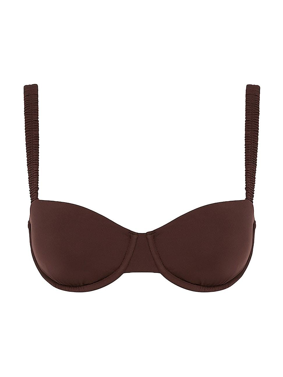 Peonys Holiday bikini top showcases a smooth balconette cup and soft removable padding. Framed by adjustable straps, this piece features ruching for a flattering detail. Made with recycled nylon Balconette cups Removable padding Adjustable straps Back closure 82% recycled nylon/8% elastane Lining: 82% recycled nylon/18% elastane Hand wash Imported SIZE & FIT Model measurements: 510 tall Model is wearing a US size Small Please note: Bikini bottom sold separately. Outerwear And Swimwear - Contemporary Swim > Peony > Saks Fifth Avenue > Barneys. Peony. Color: Grenache. Size: Small.