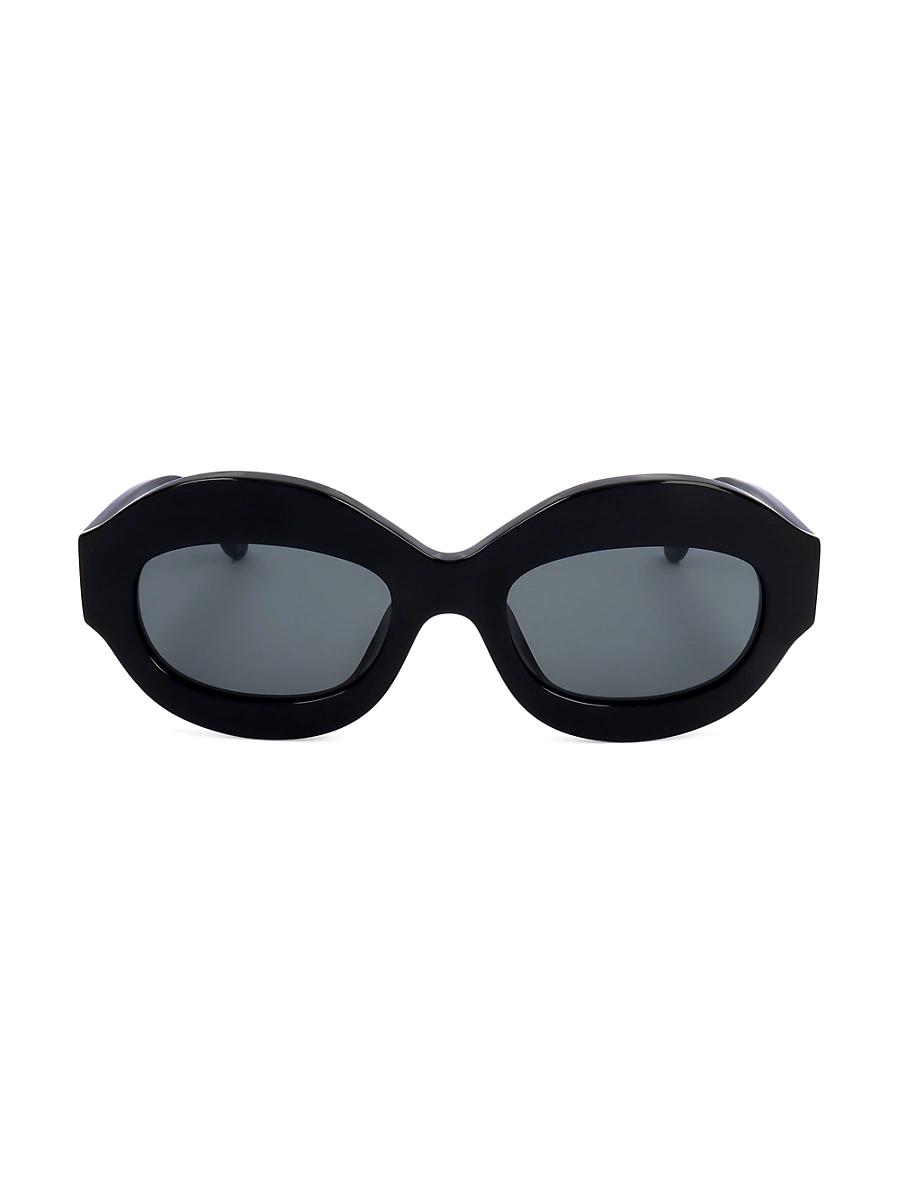Designed in Italy, Marnis Ik Kil Cenote sunglasses boast browline-skimming round frames and narrowed oval lenses. Goldtone logo detailing at the temples completes the look. 100% UV protection Tinted lenses Case and cleaning cloth included Acetate Made in Italy SIZE 54mm lens width 22mm bridge width 145mm temple length. Soft Accessories - Sunglasses > Marni > Saks Fifth Avenue > Barneys. Marni. Color: Black.