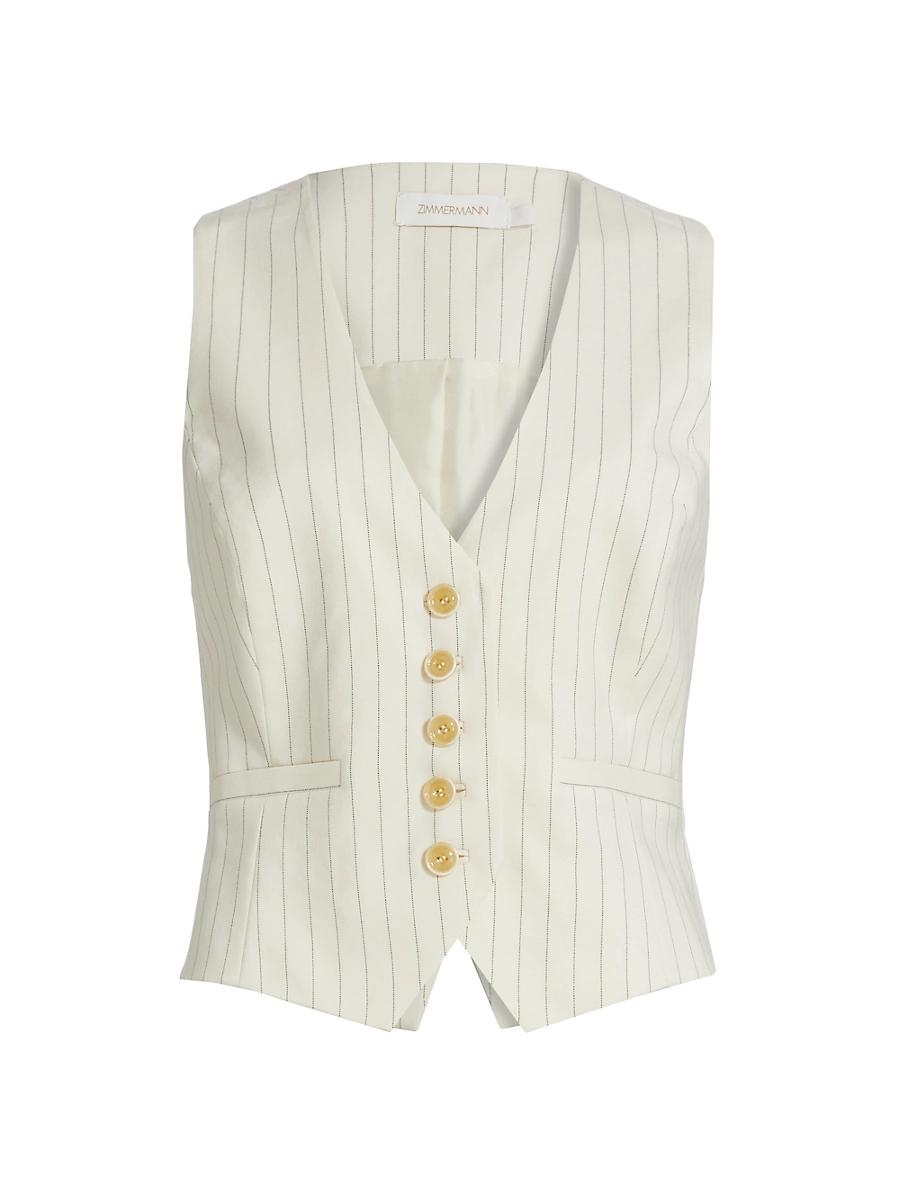 Zimmermanns wool waistcoat is detailed with a pinstriped pattern and an adjustable belt at the back. V-Neck Sleeveless Button-front closure 98% wool/2% polyester Lining: 75% viscose/25% silk Dry clean Imported SIZE & FIT About 19 from shoulder to hem Model measurements: 510 tall Model is wearing a US size Small ABOUT THE BRAND Australian founders and sister-duo Nicky and Simone Zimmermann design with a signature feminine aesthetic, each piece rife with tiers of fabric, rich embroidery and splashy prints. From ruffled bikinis and beachwear to luxe, intricately patterned maxi (and mini) dresses, everything is overtly romantic in the most elevated, effortless way. Contemporary Sportswear - Zimmermann > Zimmermann > Saks Fifth Avenue > Barneys. Zimmermann. Color: Cream. Size: 6.