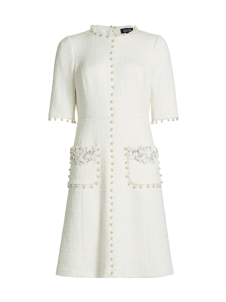 This Teri Jon by Rickie Freeman cocktail dress is rendered in a luxe boucl, trimmed with imitation pearls. Round neck Elbow-length sleeves Side patch pockets Back zip closure 51% polyester/37% viscose/12% cotton/1% elastane Lining: 100% polyester Dry clean Imported SIZE & FIT About 40.25 from shoulder to hem Model measurements: 510 tall Model is wearing a US size 4 ABOUT THE BRAND Inspired by her father, a meticulous and highly skilled tailor, designer Rickie Freeman moved to New York at 17 to attend the Fashion Institute of Technology, eventually launching her line Teri Jon by Rickie Freeman in the 1980s. Since then, Freeman has designed stunning special-occasion dresses for all women. She personally tries on every creation, ensuring every detail is perfect. Dress Collections - Teri John > Teri Jon By Rickie Freeman > Saks Fifth Avenue > Barneys. Teri Jon by Rickie Freeman. Color: White Cream. Size: 6.