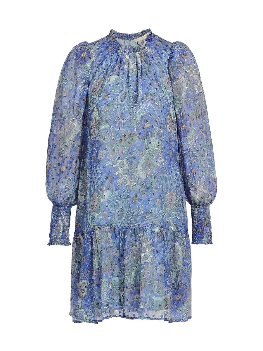 The balloon-sleeve Irena minidress from Marie Oliver boasts a ruffled neckline and mixed, layered prints. Ruffled high neck, back button closure Long balloon sleeves, smocked cuffs Pulls over 80% silk/20% viscose Dry clean Imported SIZE & FIT About 36 from shoulder to hem Model measurements: 510 tall Model is wearing a US size Small. Contemporary Sportswear - Workshop > Marie Oliver > Saks Fifth Avenue > Barneys. Marie Oliver. Color: Breeze. Size: Small.