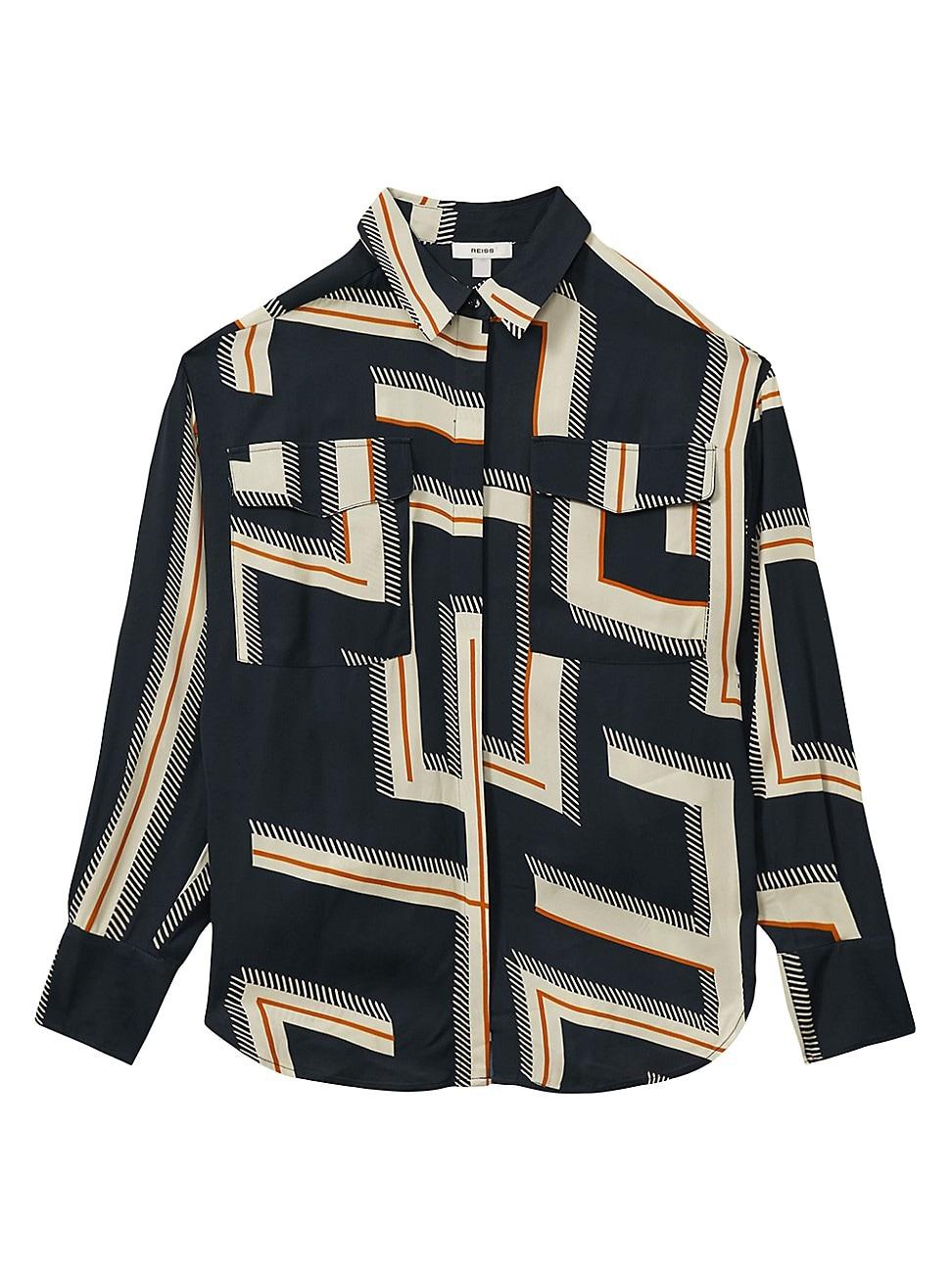 Reiss Isadora shirt features a graphic striped motif. The long-sleeve piece is designed with a point collar, chest flap pockets, and a concealed button-front closure. Point collar Long sleeves, button cuffs Chest flap patch pockets Concealed button-front closure 100% viscose Machine wash Imported SIZE & FIT About 27 from shoulder to hem Model measurements: 510 tall Model is wearing a US size 4. Modern Collections - Modern Trend > Reiss > Saks Fifth Avenue > Barneys. Reiss. Color: Navy. Size: 2.
