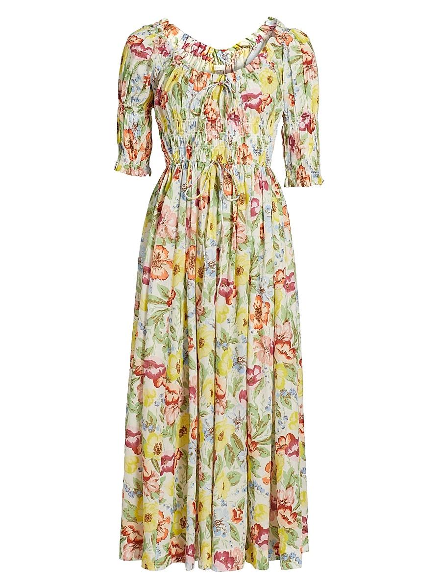 Finished in charming florals, DENs Ischia midi-dress showcases a smocked bodice, elbow-length sleeves, and a tie at the neck. Made with organic cotton Scoopneck Elbow-length sleeves Pulls over 100% organic cotton, exclusive of trim Hand wash Imported SIZE & FIT About 52 from shoulder to hem Model measurements: 510 tall Model is wearing a US size Small. Contemporary Sportswear - Workshop > Den > Saks Fifth Avenue. DEN. Color: Anemone Bloom. Size: Large.