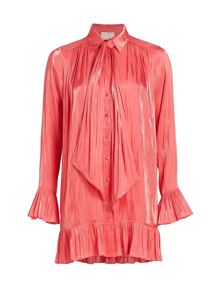 Cinq Sept Iva pliss mini shirtdress features a scarf neck-tie Approx. 34.3L from shoulder to hem Spread collar; button placket Long sleeves; approx. 33.0L Back yoke Ruffled cuffs and hem Hem hits mid-thigh Shift silhouette Polyester Lining: Polyester Dry clean Imported