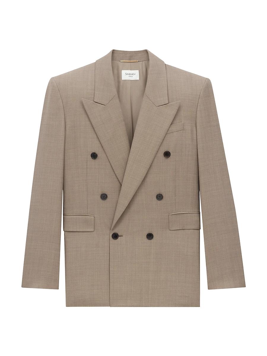 Double-breasted, six-button jacket made with wool, featuring a peaked lapel. Silk lining Double-breasted, six-button closure Two jetted pockets with flap at the front One welt pocket at the chest Peaked lapel Four-button cuffs Padded shoulders Made in Italy. Lsd Rtw - Saint Laurent Rtw > Saint Laurent > Saks Fifth Avenue > Barneys. Saint Laurent. Color: Taupe Beige. Size: 2.