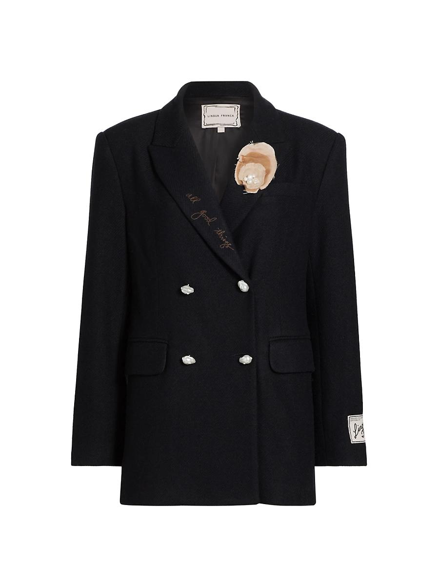 This double-breasted blazer from Lingua Franca is crafted of a luxurious wool blend. A removable rosette appliqu, adorned with baroque pearls, graces one lapel, while an embroidered All good things trim adorns the other. Matching baroque pearl buttons complete the tailored piece for a touch of refined elegance. Notch lapels Long sleeves Side flap pockets Button-front closure 70% wool/25% polyester/5% polyamide Dry clean Imported SIZE & FIT About 29 from shoulder to hem Model measurements: 510 tall Model is wearing a US size Small. Contemporary Sportswear - Trend > Lingua Franca > Saks Fifth Avenue > Barneys. Lingua Franca. Color: Navy Twill. Size: Medium.