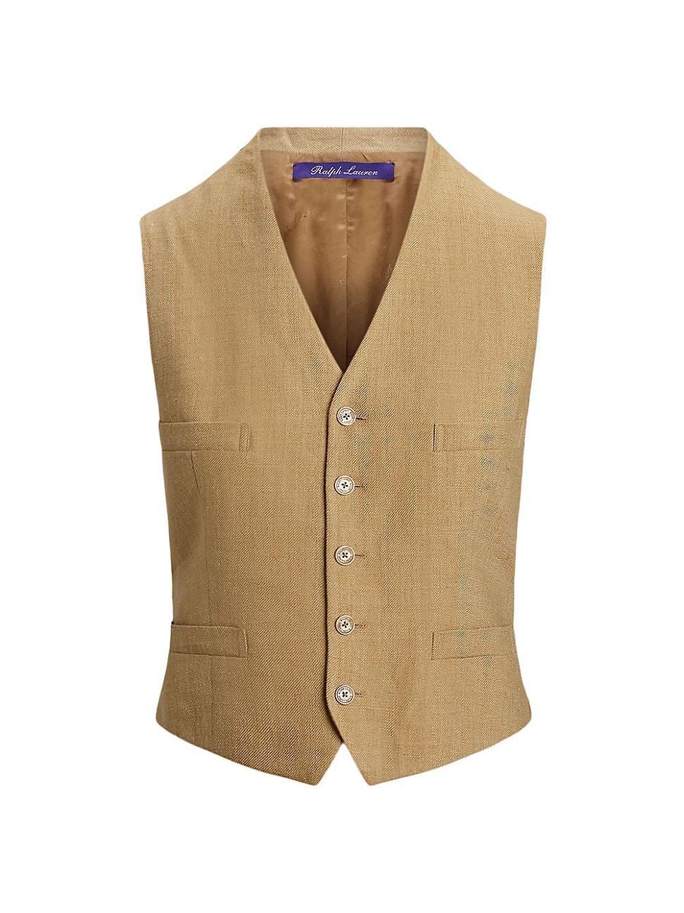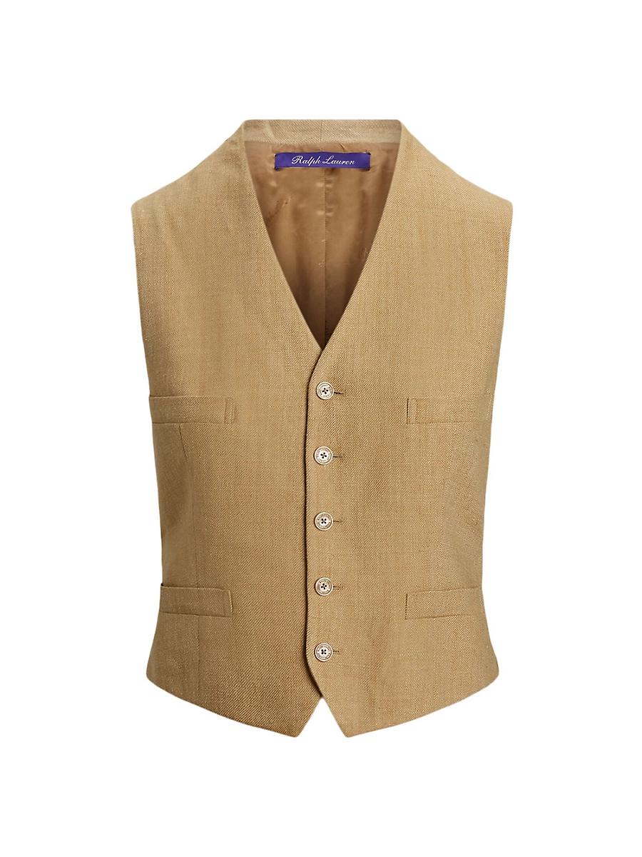 Crafted of silk and linen in a rustic twill, Ralph Laurens Jaden vest showcases a V-neck, front welt pockets, and sleeveless silhouette. V-neck Sleeveless Front welt pockets 52% silk/48% linen Lining: 95% cupro/5% elastane Dry clean Made in Italy SIZE & FIT Model measurements: 510 tall Model is wearing a US size 4. Designer Lifestyle - Ralph Lauren > Ralph Lauren Collection > Saks Fifth Avenue > Barneys. Ralph Lauren Collection. Color: Lux Tan. Size: 14.