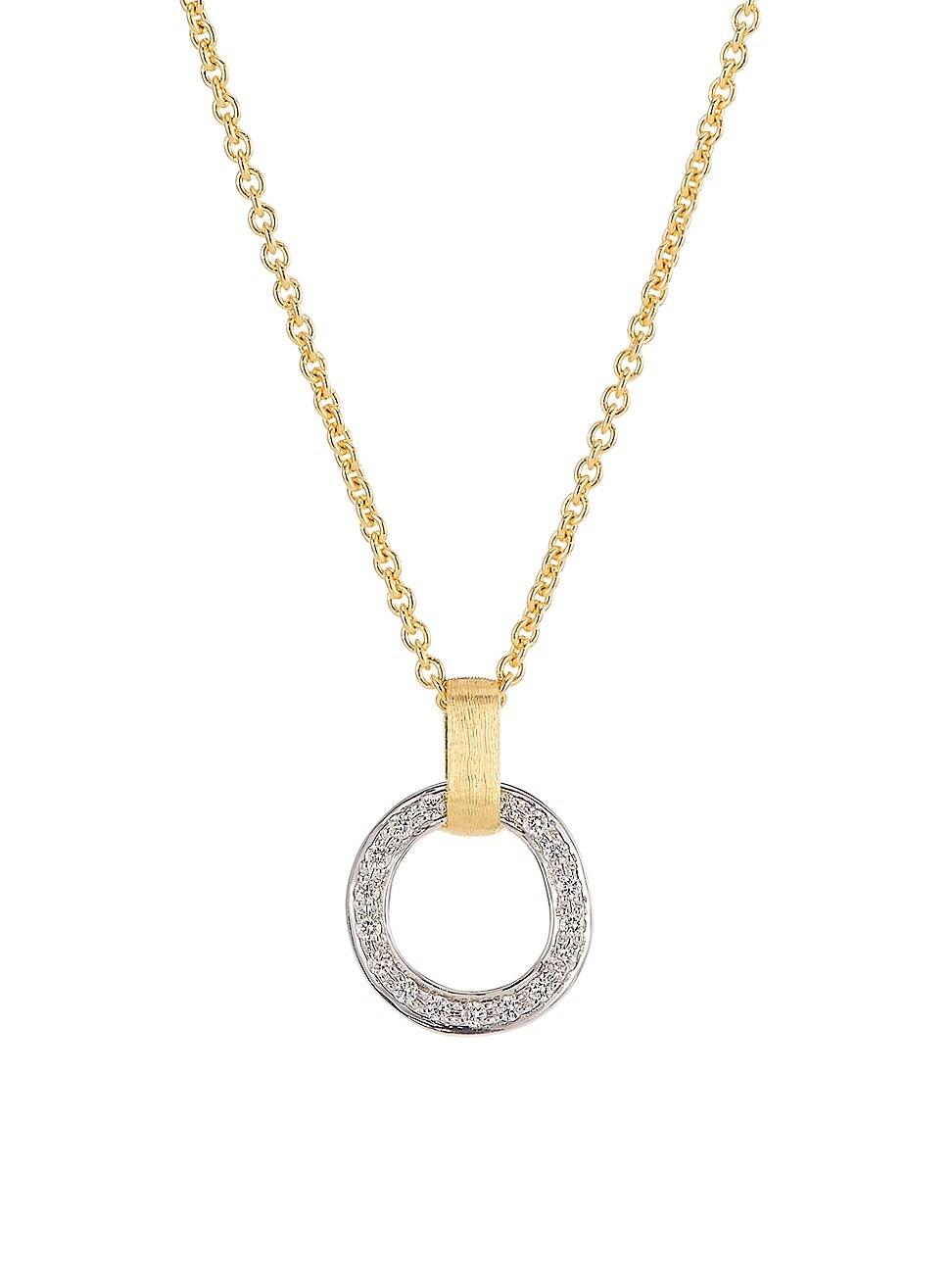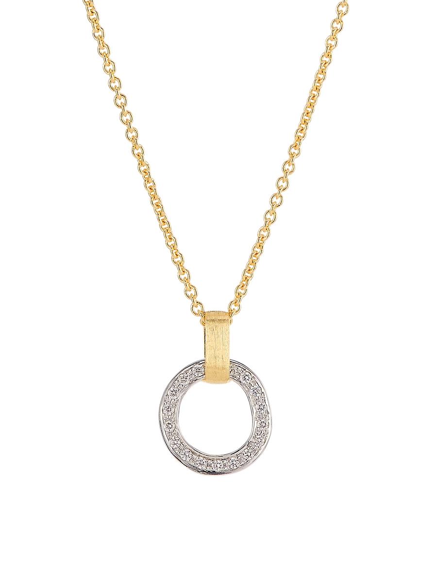 Marco Bicegos necklace features a diamond-encrusted 18K-white-gold hoop pendant suspended from an 18K-yellow-gold cable chain. From the Italian designers Jaipur Collection, this chic accessory is inspired by the rich stonecutting heritage and jewelry-making traditions of the Indian city. Diamonds, 0.14 tcw Diamond color: G-H Diamond clarity: VS1-VVS1 18K yellow and white gold Lobster clasp Made in Italy SIZE Adjustable 16.5-18 chain length Pendant drop, about 0.5 ABOUT THE BRAND Founder Giuseppe Bicego first started learning the art of goldsmithing from his father, and ultimately formed his own workshop in Trissino, Italy in 1958. Originally specializing in timeless gold chains, the jewelry house has now expanded to include finely crafted earrings, rings and necklaces in gleaming 18K gold and precious stones. Fine Jewelry - Marco Bicego A > Marco Bicego > Saks Fifth Avenue > Barneys. Marco Bicego. Color: Yellow Gold.
