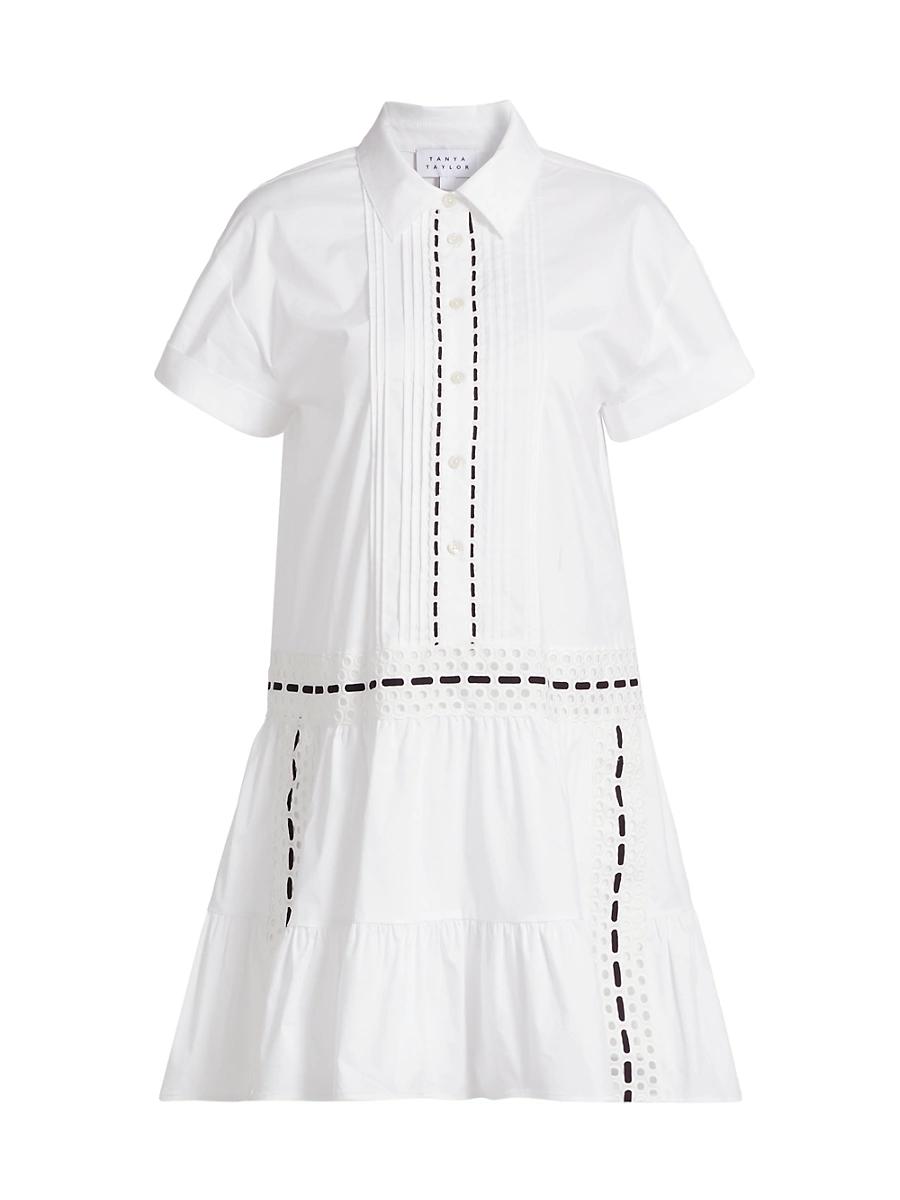 Crafted of a lightweight cotton-blend poplin, the Jasmine dress from Tanya Taylor features a button-front design with eyelet detailing and contrast stitching. Spread collar Short sleeves Button-front closure 63% cotton/37% polyester Lining: 100% cotton Dry clean Imported SIZE & FIT About 35 from shoulder to hem Model measurements: 510 tall Model is wearing a US size Small. Contemporary Sportswear - Workshop > Tanya Taylor > Saks Fifth Avenue > Barneys. Tanya Taylor. Color: White. Size: XS.