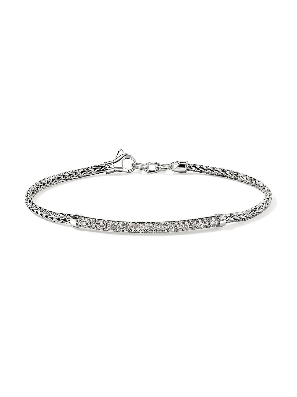 From the JH Essentials Collection. Crafted of sterling silver, John Hardys Pav bracelet features the labels signature hand-carved woven chain motif offset by a center bar of sparkling diamonds. Diamonds, 0.68 tcw Sterling silver Lobster clasp Imported SIZE About 2.5mm W. Fashion Jewelry - John Hardy > John Hardy > Saks Fifth Avenue > Barneys. John Hardy. Color: Silver. Size: Small.