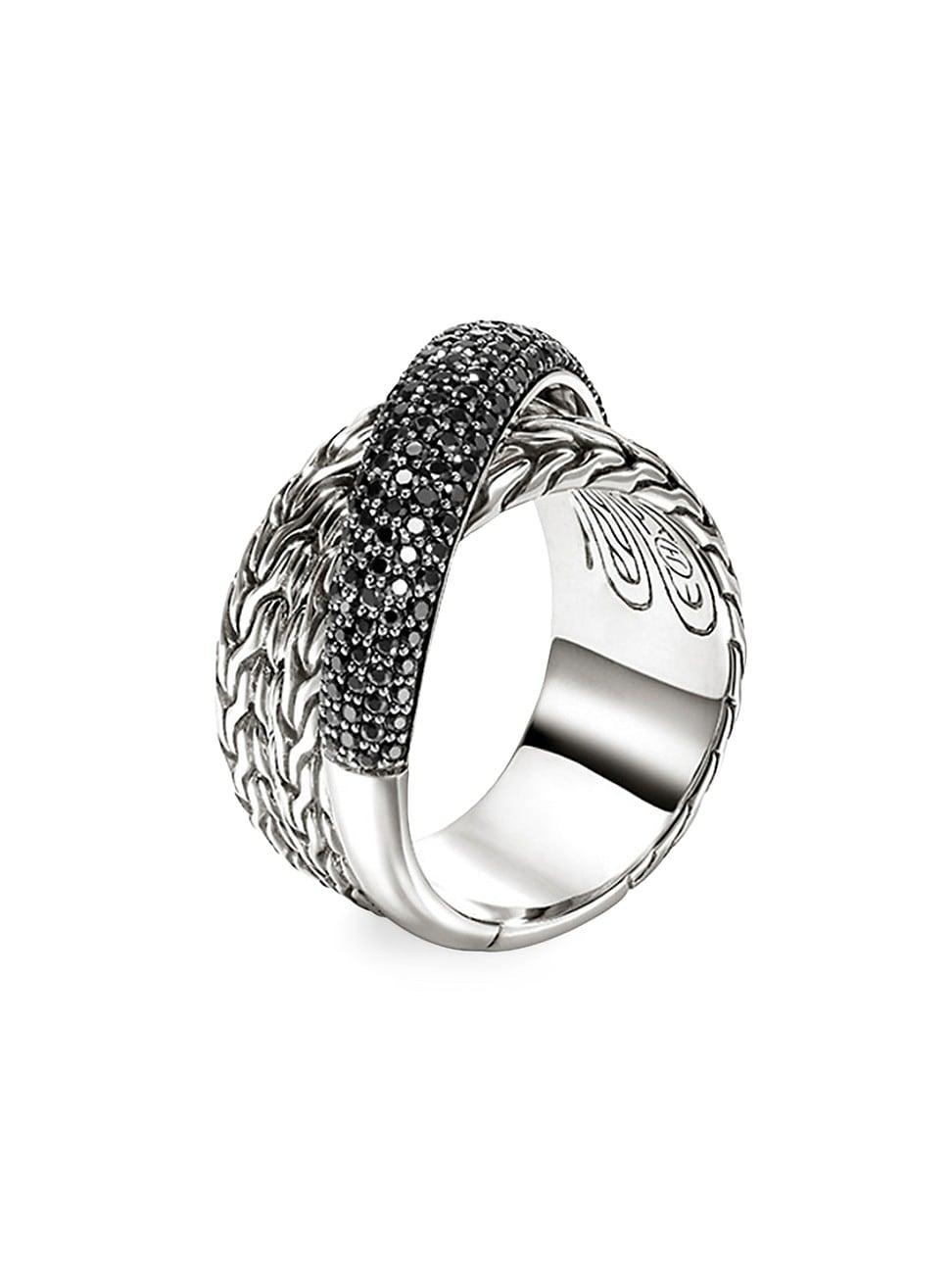 From the JH Essentials Collection. John Hardys Essential Pav crossover ring features signature carved chain in sterling silver offset by a sparkling wraparound black sapphire pav band. Black sapphires Sterling silver Imported SIZE About 0.5W. Fashion Jewelry - John Hardy > John Hardy > Saks Fifth Avenue > Barneys. John Hardy. Color: Silver. Size: 6.
