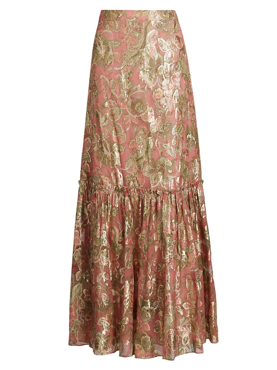 Figues Jordan maxi skirt is crafted of a metallic floral jacquard. Banded waistband Back zip closure 70% viscose/30% nylon Lining: 100% polyester Dry clean Imported SIZE & FIT Inseam: about 44.5 Model measurements: 510 tall Model is wearing a US size Small. Designer Lifestyle - Emerging Lifestyle > Figue > Saks Fifth Avenue > Barneys. Figue. Color: Floral Blushed Red. Size: 4.