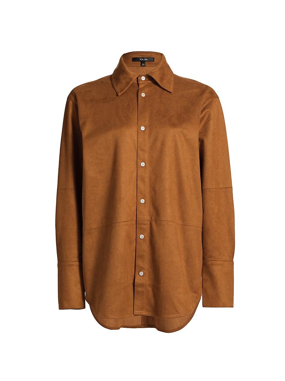 Crafted of soft faux suede, Toccins Kali boyfriend shirt showcases an oversized fit, spread collar, and long sleeves with button-barrel cuffs. Spread collar Long sleeves, button-barrel cuffs Button-front closure 100% polyester Imported SIZE & FIT About 30 from shoulder to hem Model measurements: 510 tall Model is wearing a US size Small. Modern Collections - Branded Separates > Toccin > Saks Fifth Avenue > Barneys. Toccin. Color: Saddle. Size: Medium.
