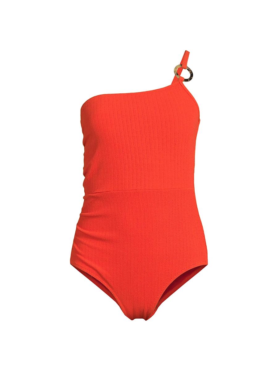 Change of Scenerys textured Kara one-piece swimsuit showcases a sleek one-shoulder silhouette with an elegant asymmetric neckline and a striking tortoiseshell-like ring detail at the shoulder. Made from eco-friendly recycled nylon with UPF 50+ protection, this swimsuit features subtle draping for a flattering hourglass shape, a supportive elastic shelf bra, removable bust pads, and an adjustable strap for versatile styling, even as a bodysuit for evening wear. Made with recycled nylon One-shoulder neck Adjustable straps Shelf-bra, removable pads Power mesh compression liner waist Full coverage Pulls on 90% recycled nylon/10% spandex Lining: 90% polyester/10% spandex Hand wash Imported SIZE & FIT About 20 from shoulder to hem Model measurements: 510 tall Model is wearing a US size Small ABOUT THE BRAND Born in 2022, Change of Scenery is a luxury swimwear and resortwear label founded by fashion industry veteran Jamie Banks. Each piece delivers optimal fit, comfort and support while maintaining a joyful aesthetic, from bright bikinis to party-ready dresses. The sustainabilty-forward brands plentiful coordinating offerings make styling beach-to-boardwalk looks a breeze. Change of Scenery is a member of 1% for the Planet and donates 1% of all sales to environmental charity organizations. Outerwear And Swimwear - Modern Swim > Change Of Scenery > Saks Fifth Avenue > Barneys. Change of Scenery. Color: Flame Texture. Size: Medium.