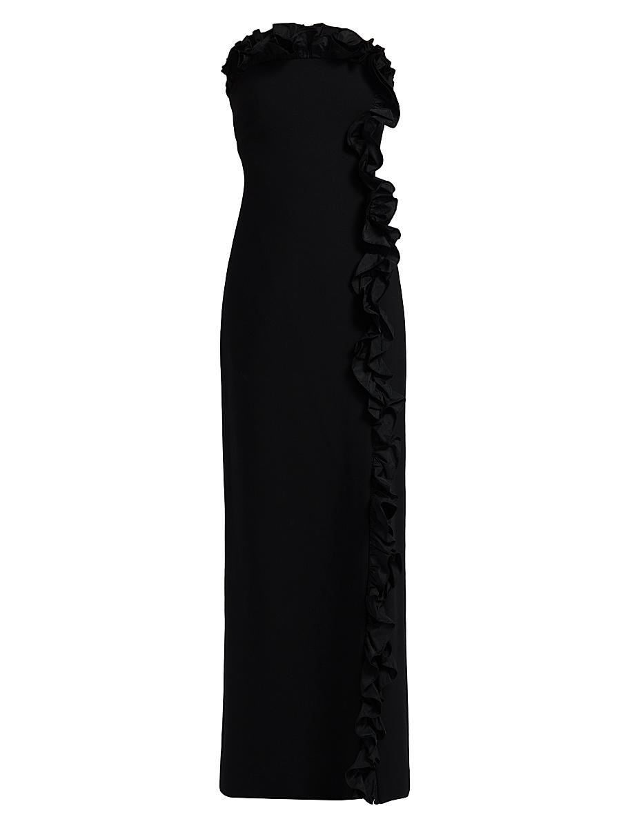 The Kassia gown from Cinq Sept is designed in a formfitting, strapless silhouette. An elegant ruffle cascades beautifully down the front, creating a striking visual effect on this floor-length piece. Strapless Concealed back zip closure 67% polyester/27% viscose/6% elastane Dry clean Imported SIZE & FIT About 56.5 from shoulder to hem Model Measurements: 510 tall Model is wearing a US size 4 ABOUT THE BRAND Inspired by the radiant, magical hours between 5 and 7 PM-which is what the labels