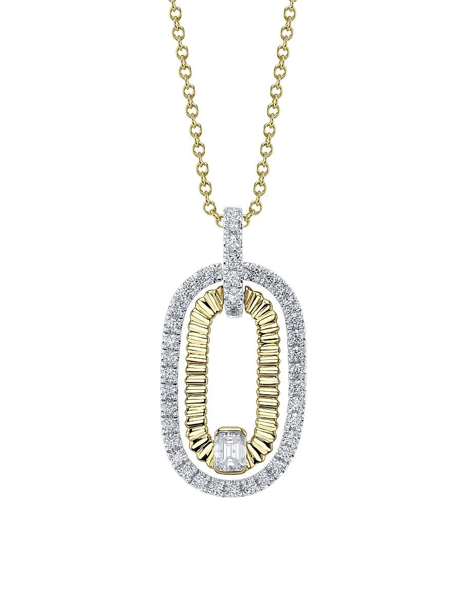 From the Kate Collection. Handcrafted of 14K yellow gold, this necklace from Shy Creation features a concentric oval pendant with shimmering pav diamonds set in white gold. A single emerald-cut diamond completes this stunning accessory. Diamonds, 0.46 tcw Diamond color grade: G-H Diamond clarity grade: SI 14K yellow and white gold Lobster clasp Imported SIZE Chain: about 18L Pendant: about 0.45W x 0.95L. Fine Jewelry - Fine Designer Jewelry C > Shy Creation > Saks Fifth Avenue. Shy Creation.