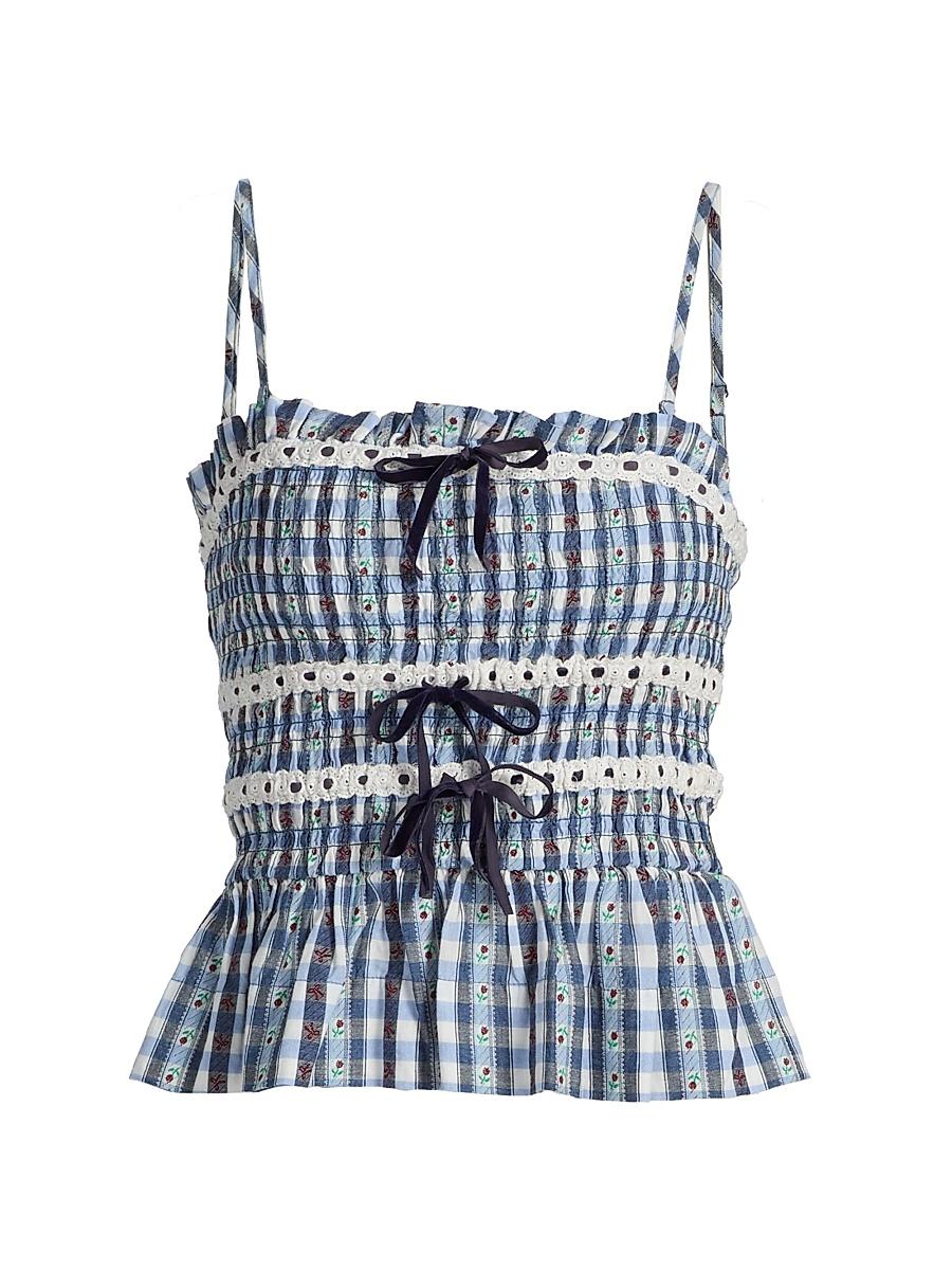 Damson Madders Katya cami top highlights the lightweight cotton with a charming floral gingham print. Tailored with a smocked bodice, this piece features velvet bows, lace trimming, and self-tie straps. Straight neck Self-tie straps Pulls over 100% cotton Trim: 100% polyester Hand wash Imported SIZE & FIT This style is designed for a relaxed fit About 21.5 from topline to hem Bust: about 32.25 Waist: about 26 Model measurements: 510 tall Model is wearing a US size 4. Contemporary Sportswear - Trend > Damson Madder > Saks Fifth Avenue > Barneys. Damson Madder. Color: Margot Gingham. Size: 4.