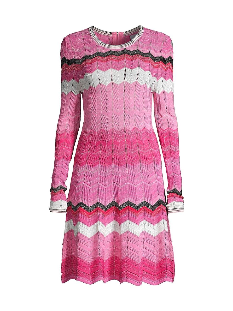 This long-sleeve knee-length dress from Milly offers a breathable pointelle-knit outer and metallic zigzag pattern. Scoopneck Drop shoulders Long sleeves Scalloped hem Back zip closure 50% viscose/29% nylon/15% polyester/6% metal Hand wash Imported SIZE & FIT About 32.5 from shoulder to hem Model measurements: 510 tall Model is wearing a US size Small. Modern Collections - Milly > Milly > Saks Fifth Avenue > Barneys. Milly. Color: Pink Multi. Size: XS.