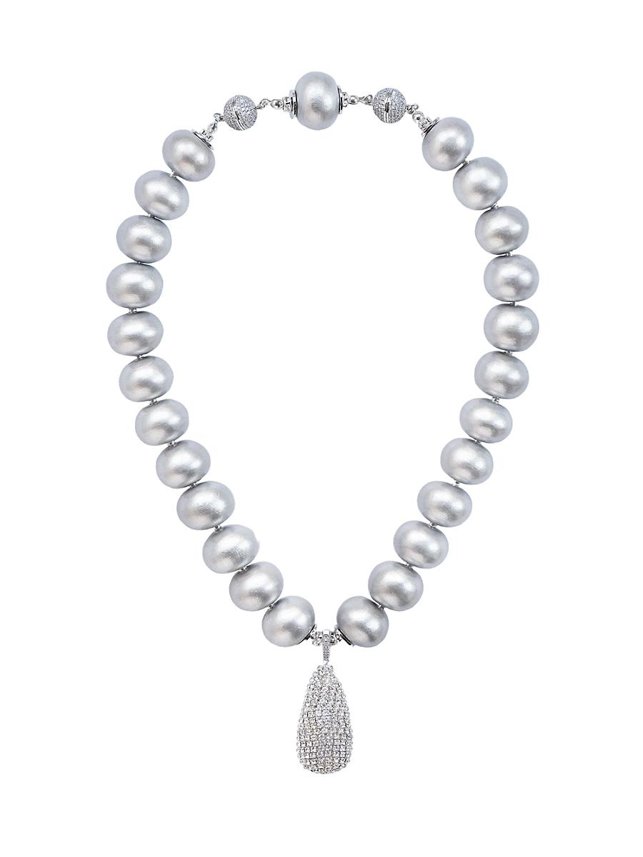 From the La Dolce Vita Collection. Threaded with silver hand-painted wooden beads, Sauls striking Serafina necklace features a pear-shaped rhinestone-encrusted pendant. Rhinestones Wood Silver-plated brass Made in USA SIZE Necklace: about 17.5L Pendant: about 2.13L. Fashion Jewelry - Trend Jewelry > Saul > Saks Fifth Avenue > Barneys. Saul. Color: Lunar Glow.
