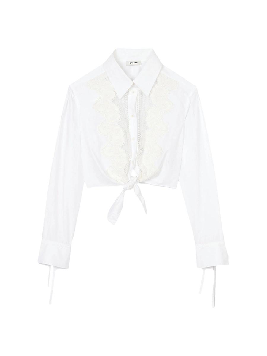 Tie-hem shirt with long sleeves and lace bib. E25ANDREA Sandro Womens tie-hem shirt Lace bib Long sleeves Button placket Tie cuffs Cropped fit Main material: 100% Organic cotton Lace band: 100% cotton Buttons: 100% nacre Imported SIZE & FIT Model measurements: 58 Model is wearing a size 1. Lsd Rtw - Sandro > Sandro > Saks Fifth Avenue > Barneys. Sandro. Color: White. Size: Medium.