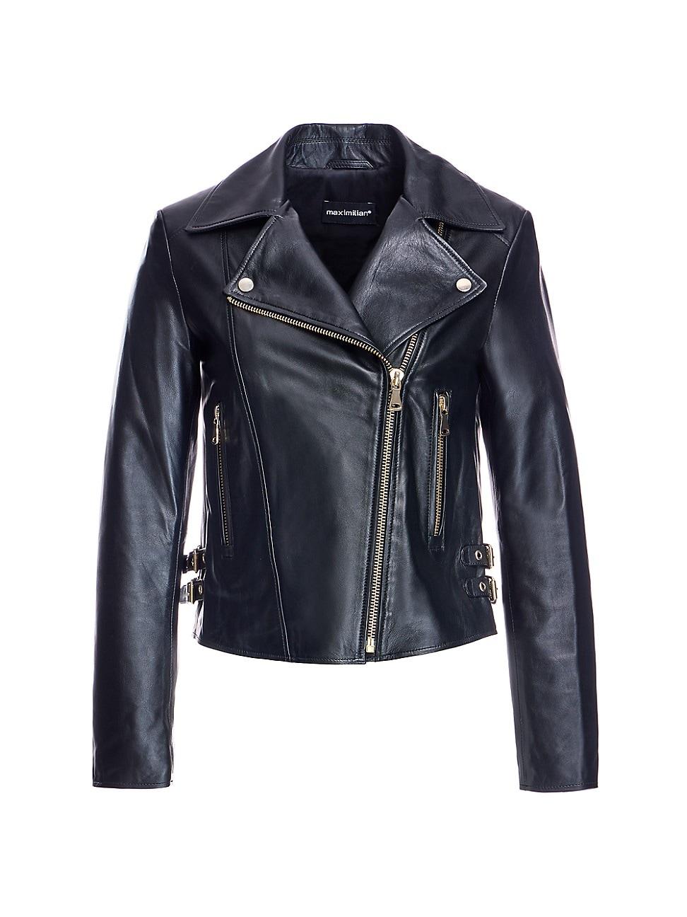 Cut in soft lambskin, Maximilians biker jacket features archetypal styling adorned with goldtone hardware for an elevated finish. Notch collar Long sleeves Asymmetric zip front Waist zip pockets Buckle-tab waist Lined Leather Dry clean by leather specialist Imported SIZE & FIT About 21 from shoulder to hem Model measurements: 510 tall Model is wearing a US size Small. Furs - Fur Salon Direct > Maximilian > Saks Fifth Avenue > Barneys. Maximilian. Color: Black. Size: Small.