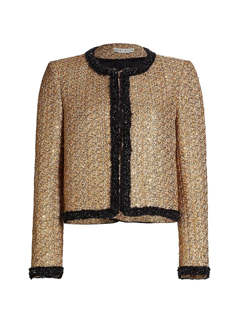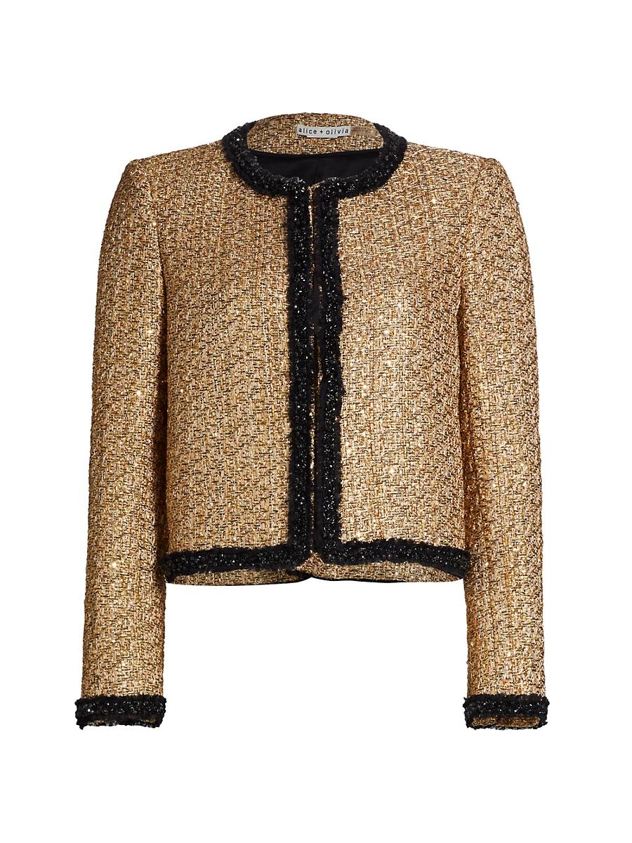 The Landon jacket from Alice + Olivia is crafted of metallic tweed with embellished contrast trim. Round neck Long sleeves Front hook-and-eye closures 100% polyester Lining: 95% polyester/5% elastane Dry clean Imported SIZE & FIT About 20 from shoulder to hem Model measurements: 510 tall Model is wearing a US size Small ABOUT THE BRAND Founder Stacey Bendet has been embracing bold color, eclectic prints and an overall passion for whimsy since launching Alice + Olivia in 2002. From party-ready dresses to statement tops and everything in between, shes created a playful and overtly feminine aesthetic thats uniquely her own. Contemporary Sportswear - Alice + Olivia > Alice + Olivia > Saks Fifth Avenue > Barneys. Alice + Olivia. Color: Gold. Size: XL.
