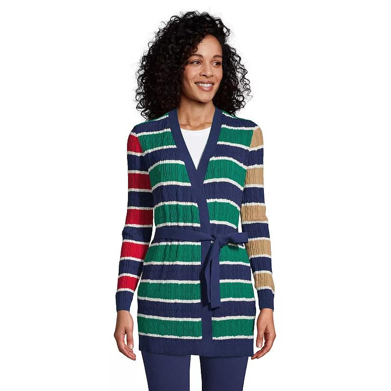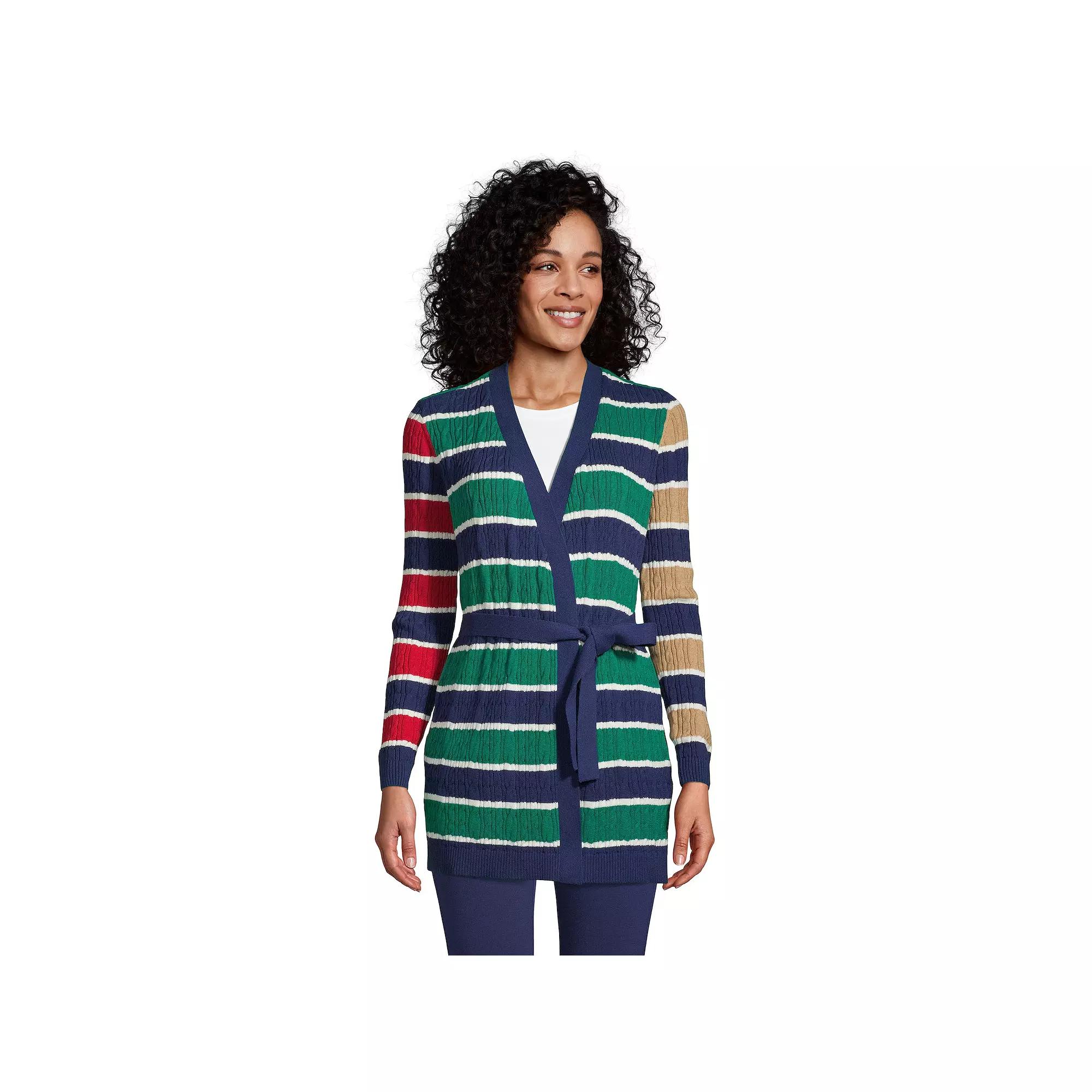 This cardi is all tied up in comfy texture. This women's petite cardigan from Lands' End, in pretty colors, is designed to instantly create the no-fuss style you love. This cardi is all tied up in comfy texture. This women's petite cardigan from Lands' End, in pretty colors, is designed to instantly create the no-fuss style you love. Rib knit cuffs and hem Adjustable tie belt with chainstitch belt loops at side seams; removable for versatility Side welt pockets Soft, all-cotton knit Fun cable texture Long sleeves Open frontFIT & SIZING Flattering tunic lengthFABRIC & CARE Cotton Machine wash Imported Size: L Petite. Color: Blue. Gender: female. Age Group: adult. Pattern: Stripe.