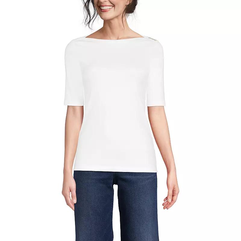 Elevate your casual wardrobe with this stylish elbow sleeve tee from Lands End, designed with a chic boat neckline and a decorative button placket for a touch of flair. Its relaxed fit and soft cotton ensure all-day comfort, making it a versatile piece to pair effortlessly with jeans or skirts for any occasion.Click on this WOMENS GUIDE to find the perfect fit and more!Elevate your casual wardrobe with this stylish elbow sleeve tee from Lands End, designed with a chic boat neckline and a decorative button placket for a touch of flair. Its relaxed fit and soft cotton ensure all-day comfort, making it a versatile piece to pair effortlessly with jeans or skirts for any occasion.Click on this WOMENS GUIDE to find the perfect fit and more!FEATURES Boatneck Elbow sleeves Set-in sleeves Decorative button placket on left shoulder Straight hem Pullover stylingFIT & SIZING Relaxed, straight fit 30-in. length from shoulder to hemFABRIC & CARE Cotton Machine wash Imported Size: S Tall. Color: White. Gender: female. Age Group: adult.