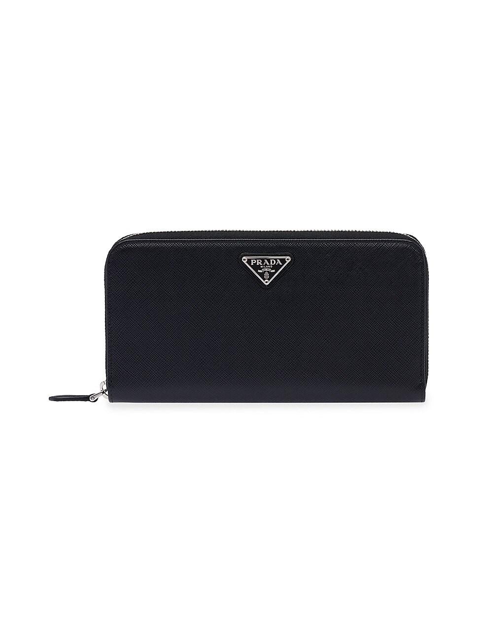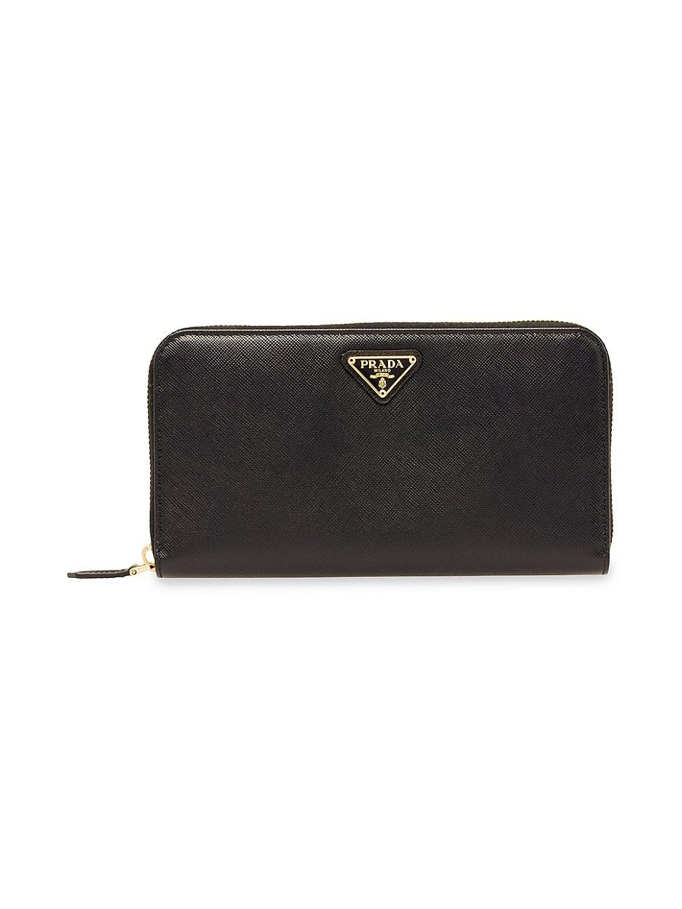 A curved-edged saffiano leather wallet containing 1 bill compartment with zipper, 12 credit card slots, 6 document pockets and 1 coin compartment with zipper. The piece is finished with the Prada logo and zipper closure. Zipper closure Enameled metal triangle logo Two bill compartments Twelve card slots Two internal pockets Internal coin pocket with zipper Moire and Saffiano leather lining Imported This product is not eligible for extended holiday returns SIZE: 7.8 W x 4 H. Lsd Handbags - Prada Handbags Access > Prada > Saks Fifth Avenue > Barneys. Prada. Color: Black.