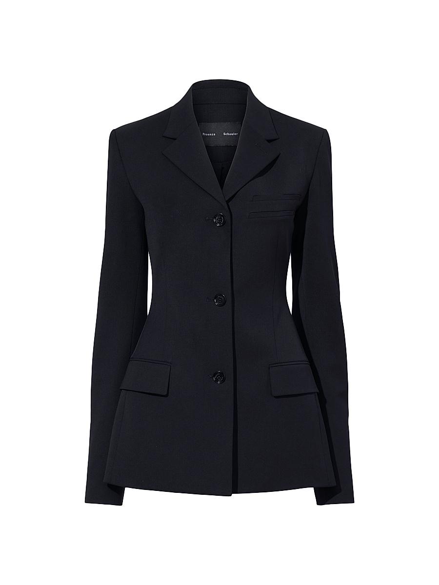 Crafted in Italy, Proenza Schoulers Lark blazer showcases polished notch lapels and front flap pockets. Notch lapels Long sleeves, button cuffs Chest welt pocket Front flap pockets Button-front closure 76% virgin wool/22% polyamide/2% elastane Dry clean Made in Italy SIZE & FIT Model measurements: 510 tall Model is wearing a US size 4 ABOUT THE BRAND Designers Jack McCollough and Lazaro Hernandez collaborated on their senior thesis at NYCs Parsons School of Design in 2002, which led to the official launch of Proenza Schouler-an homage to their mothers maiden names. Their innovative, well-tailored clothing has since earned them five CFDA awards. In 2008, the brand debuted a line of handbags, with the PS1 instantly gaining a cult following. Today, they also create sleek, edgy footwear. Designer Lifestyle - Proenza Schouler > Proenza Schouler > Saks Fifth Avenue > Barneys. Proenza Schouler. Color: Black. Size: 0.