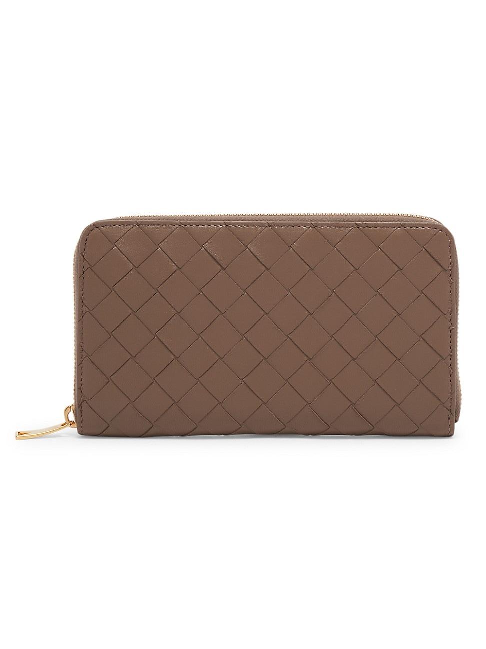 Crafted in Italy, this wallet from Bottega Veneta is crafted of leather woven in the houses signature Intrecciato pattern and designed with goldtone hardware. Zip-around closure Leather Lining: leather Made in Italy SIZE About 7.5W x 4.5H x 1D ABOUT THE BRAND Founded in 1966, the label known for fine Italian craftsmanship with creativity at its core has since catapulted to cult-level status. The houses storied intrecciato pattern in shoes and handbags, alongside its signature minimalist ready-to-wear, have made the label an editor and It-girl favorite. Handbags - Bottega Veneta Handbags > Bottega Veneta > Saks Fifth Avenue > Barneys. Bottega Veneta. Color: Pinecone.