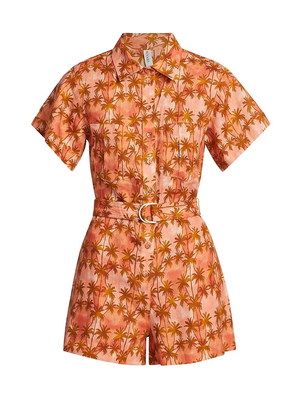 Kivaris linen Leilani romper features a palm tree print and a belt to define the waist. Spread collar Short sleeves Chest patch pockets Self-tie belt Button-front closure 100% linen Dry clean Imported SIZE & FIT Rise: about 12 Inseam: about 2.5 Model measurements: 510 tall Model is wearing a US size 4. Contemporary Sportswear - Trend > Kivari > Saks Fifth Avenue > Barneys. Kivari. Color: Leilani. Size: 12.