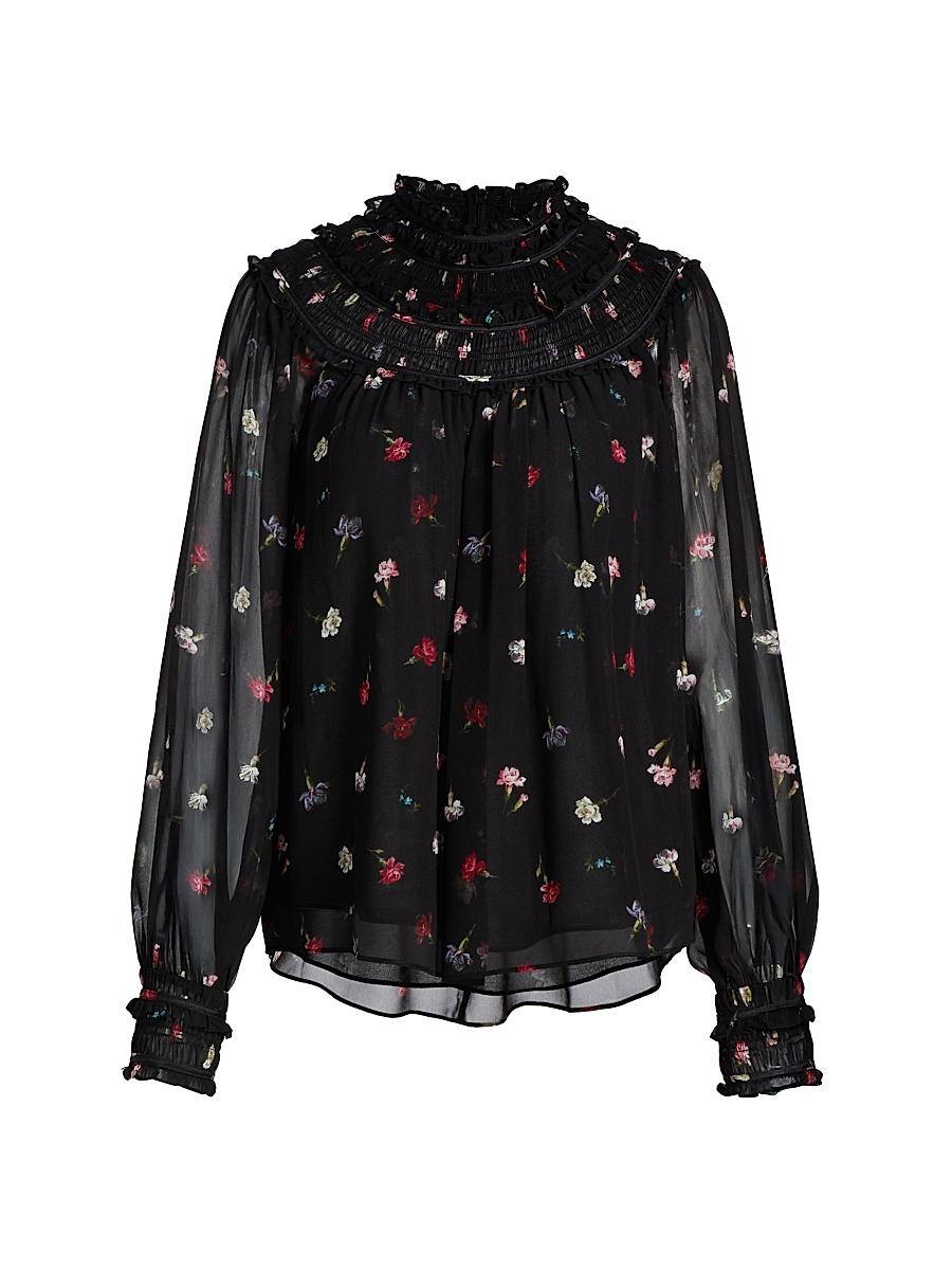 The Leopold top from Cinq Sept is designed with the brands signature Tumbling Carnations print, featuring a ruffled neck and relaxed silhouette. Ruffled neck Long sleeves, elasticized cuffs Concealed back zip closure 100% polyester Dry clean Imported SIZE & FIT About 25.25 from shoulder to hem Model measurements: 510 tall Model is wearing a US size Small ABOUT THE BRAND Inspired by the radiant, magical hours between 5 and 7 PM-which is what the labels French name translates to-founder Jan