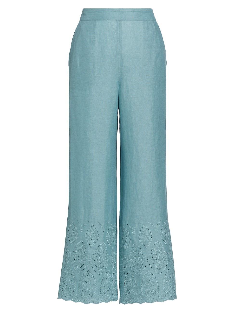 Crafted of European linen, Elie Taharis Lesley pull-on pants feature a wide-leg silhouette and paisley eyelet detailing at the hems. Elasticized waistband Side slip pockets Pulls on 100% linen Lining: 100% cotton Dry clean Imported SIZE & FIT Rise: about 11.5 Inseam: about 29 Leg opening: about 22 Model measurements: 510 tall Model is wearing a US size Small. Modern Collections - Elie Tahari > Elie Tahari > Saks Fifth Avenue > Barneys. Elie Tahari. Color: Blue Breeze. Size: XL.