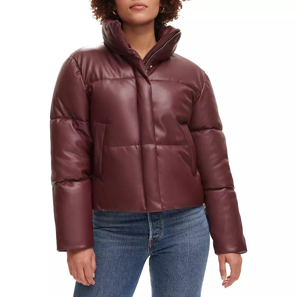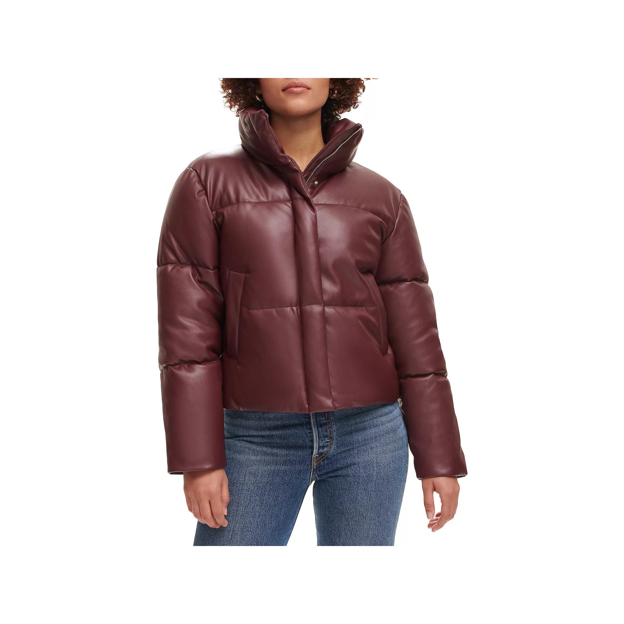 Add a luxe note to staying toasty warm in this short puffer crafted from smooth, buttery soft faux leather with water-resistant properties. 23 1/2 length Stand collar Water-resistant Lined, with polyester fill 100% polyurethane Machine wash, tumble dry Imported
