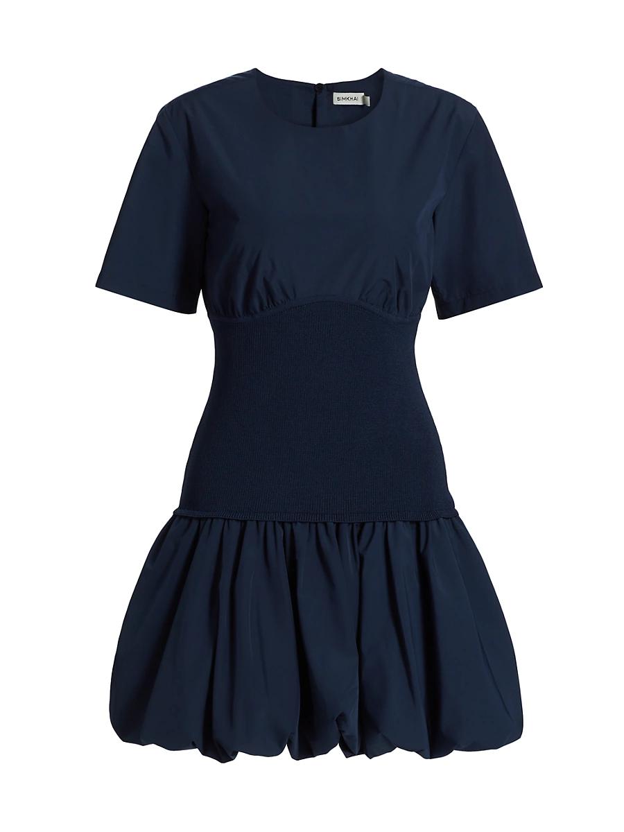 Styled with a rib-knit waist, the Libbie minidress from SIMKHAI is defined by a voluminous bubble hem. Crewneck Short sleeves Back button-and-loop closure 100% polyester Combo: 83% viscose/17% polyester Lining: 100% cotton Dry clean Imported SIZE & FIT This style is constructed in with a stretch panel for a fitted shape About 34 from shoulder to hem Bust: about 36 Model measurements: 510 tall Model is wearing a US size Small. Contemporary Sportswear - Workshop > Simkhai > Saks Fifth Avenue > Barneys. SIMKHAI. Color: Midnight. Size: Medium.