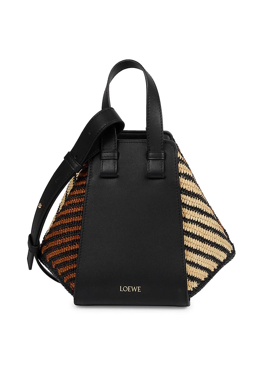 Creative Director Jonathan Anderson captures the carefree aesthetic of island life in his lively collection for LOEWE. Inspired by Paulas, Armin Heinemanns legendary Spanish boutique, the design visionary presents original archive prints, dynamic fabrics, and laid-back silhouettes. Crafted of a mix of striped raffia and leather, the Hammock Compact bag from LOEWE features a removable shoulder strap and zippered sides. Two top handles Adjustable, removable shoulder strap Side zippers Clip closure Raffia Trim: leather Made in Spain. Handbags - Loewe Handbags > Loewe > Saks Fifth Avenue > Barneys. LOEWE. Color: Black Natural.