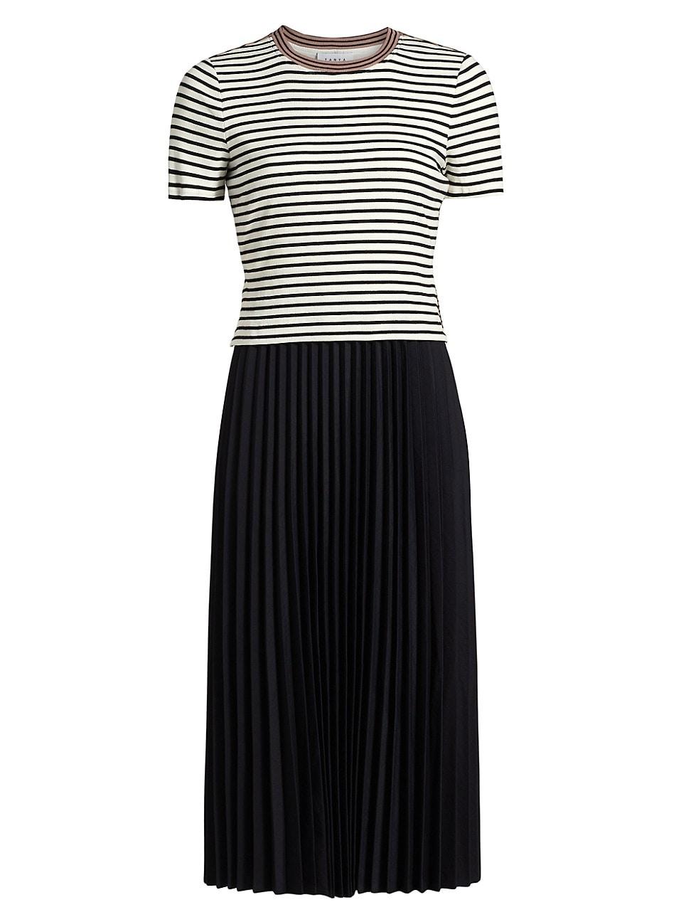 Tanya Taylors Logan midi-dress highlights a striped T-shirt-inspired bodice and a box-pleated skirt. Crewneck Short sleeves Pulls over 95% cotton/ 5% elastane Combo: 80% polyester/ 20% cotton Lining: 95% cotton/ 5% elastane Dry clean Imported SIZE & FIT About 49 from shoulder to hem Model measurements: 510 tall Model is wearing a US size 4. Contemporary Sportswear - Workshop > Tanya Taylor > Saks Fifth Avenue > Barneys. Tanya Taylor. Color: White Black Multi. Size: Small.