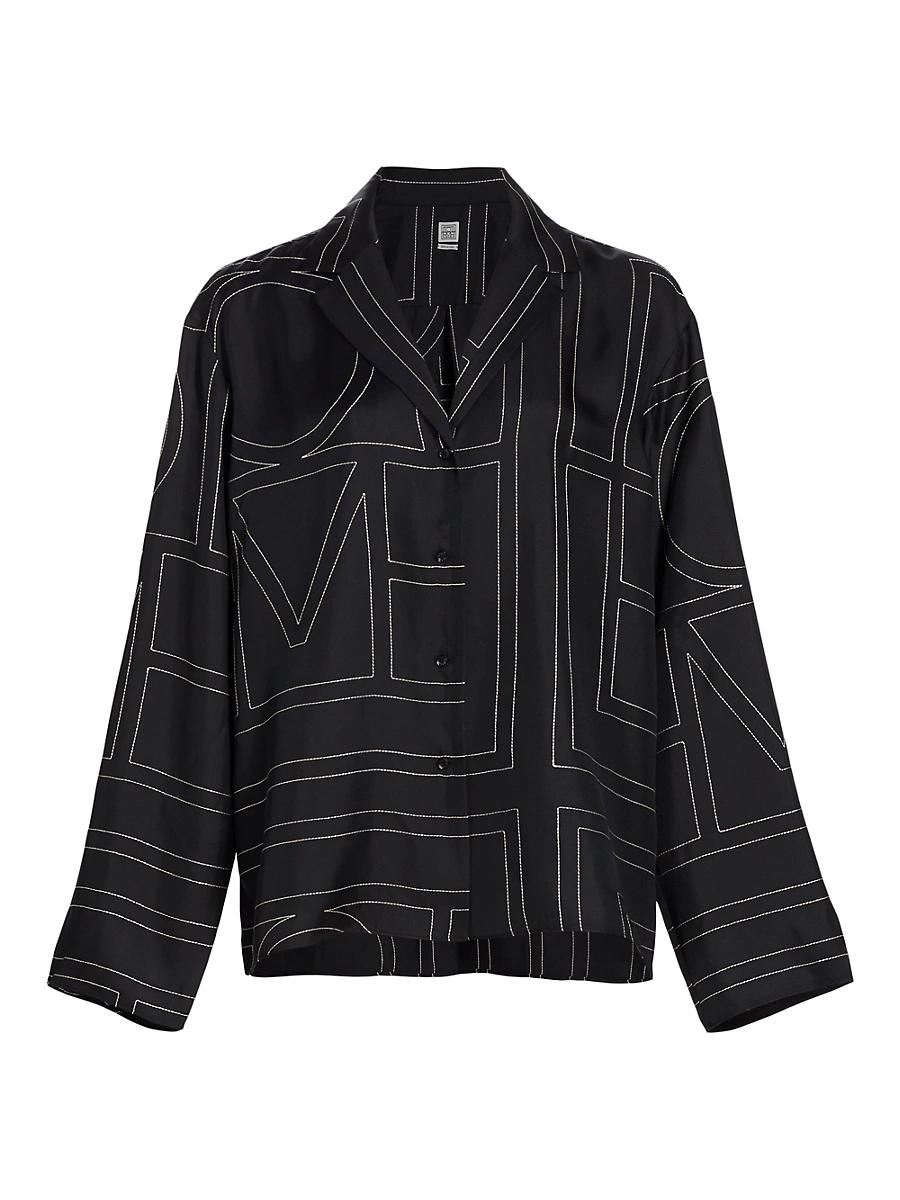 Woven from a lustrous silk, Totmes boxy button-front top is defined by a large-format stitched monogram motif. Please note: pattern may vary by style. Notch collar Drop shoulders Long sleeves Button front Back yoke 100% silk Dry clean Imported SIZE & FIT This style is designed for a relaxed fit Measurements are taken from a US size 4 About 27 from shoulder to hem Model measurements: 510 tall Model is wearing a US size 4. Advanced Designer - Designer Emerging Brands > Toteme > Saks Fifth Avenue > Barneys. Toteme. Color: Black Monogram. Size: 10.