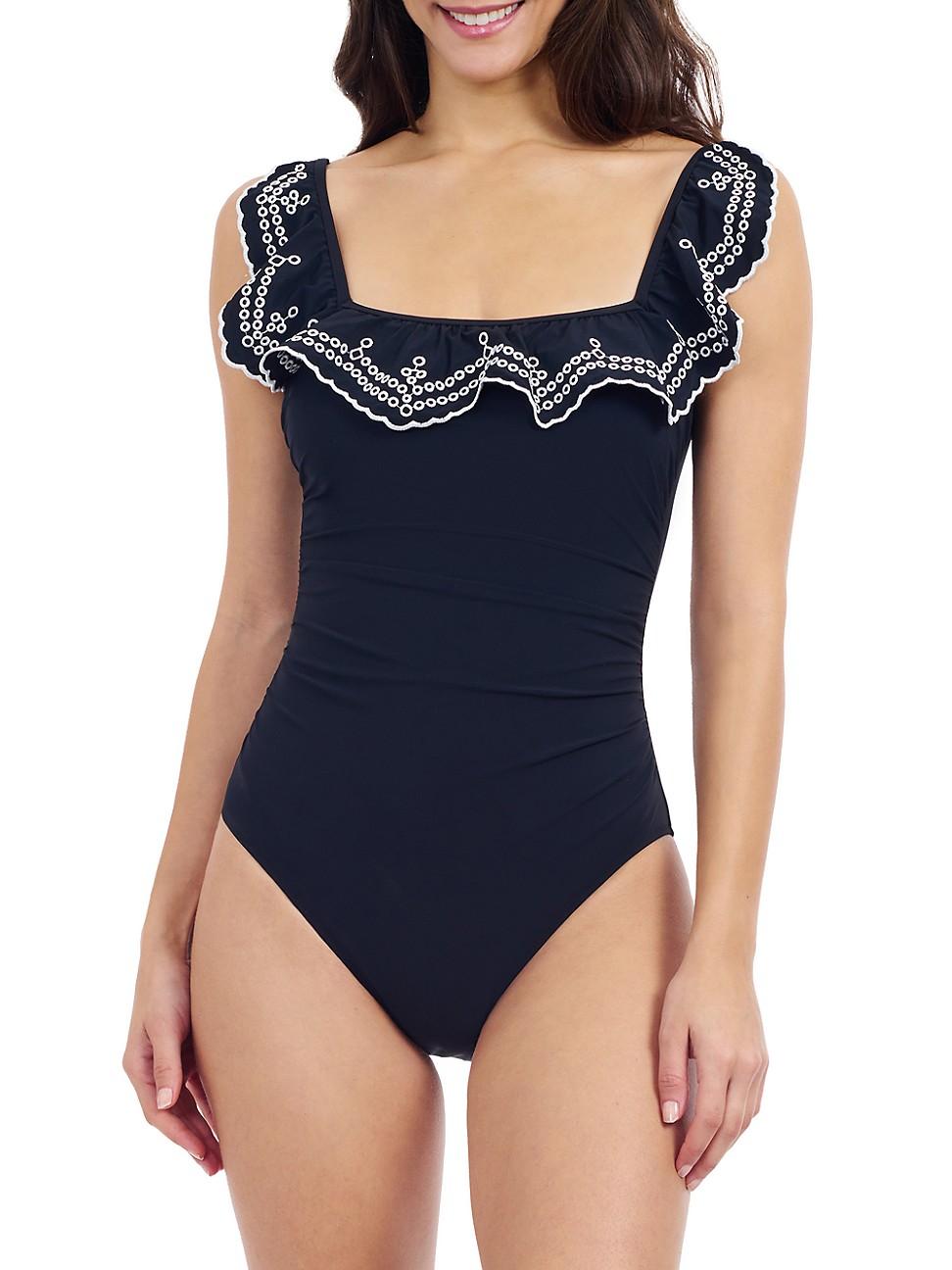 Gottex Swimwears Lola swimsuit is styled with a ruffled neckline and ruching at the waist. Square neck Flutter straps Ruched waist Pulls on 73% nylon/27% Lycra spandex Hand wash Imported SIZE & FIT Model measurements: 510 tall. Outerwear And Swimwear - Gottex > Gottex Swimwear > Saks Fifth Avenue > Barneys. Gottex Swimwear. Color: Black. Size: 12.