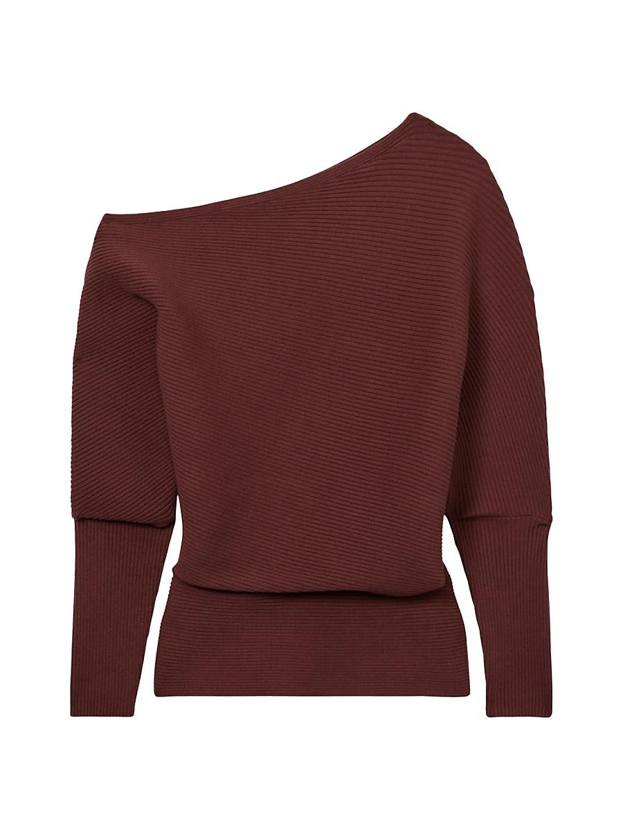 Reiss classic one-shoulder Lorna sweater showcases a rib-knit trim, long sleeves, and a relaxed fit. One-shoulder neck Long sleeves Pulls over 58% viscose/24% polyester/16% nylon/2% elastane Dry clean Imported SIZE & FIT Model measurements: 510 tall Model is wearing a US size Small. Modern Collections - Modern Trend > Reiss > Saks Fifth Avenue > Barneys. Reiss. Color: Burgundy. Size: XL.