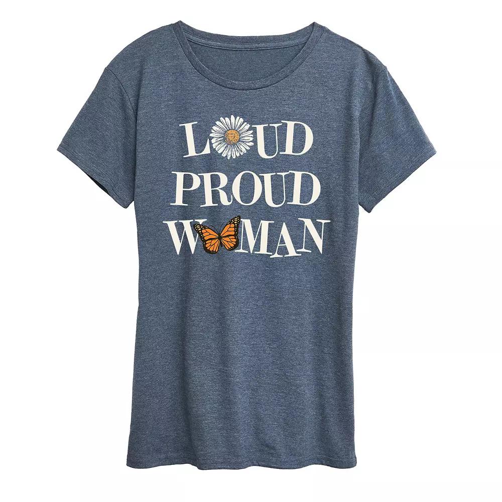Heather Blue Loud Proud Woman Graphic Tee - Women & Plus. Casual short-sleeve tee with a relaxed-fit silhouette and an expressive graphic. Full graphic text: Loud proud woman.Size S: 26 long from high point of shoulder to hemSize & fit: Relaxed-fit garment with a slightly longer hem. Fits true to size.50% cotton / 50% polyesterMachine wash; tumble dryImported, screen printed in the USA