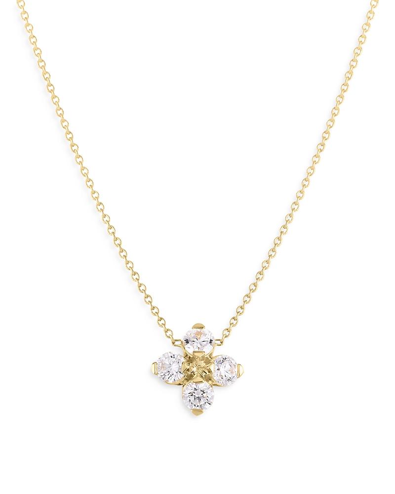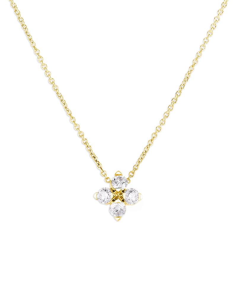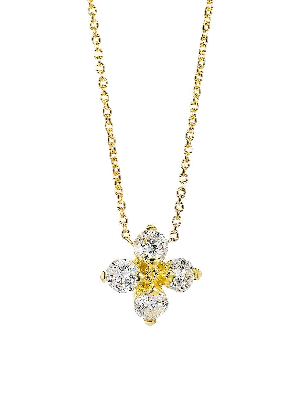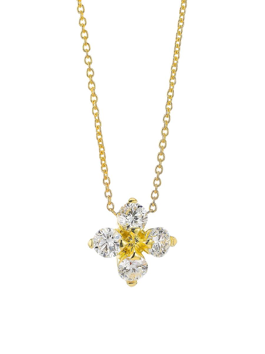 From the Love in Verona Collection. Made of 18K yellow gold, Roberto Coins necklace features a flower pendant that sparkles with four round brilliant-cut diamonds. The renowned designer signs each piece with a single ruby placed in a concealed location. Diamonds, 0.55 tcw Diamond color: G-H Diamond clarity: SI 18K yellow gold Lobster clasp Made in Italy SIZE Chain length, about 18 Pendant drop, about 10mm ABOUT THE BRAND Jewelry designer Roberto Coin founded his eponymous line in 1996, with a strong emphasis on elegance and creative experimentation. Each piece is the result of a long creative process, taking inspiration from cultural influences and nature. Fine Jewelry - Roberto Coin Asset > Roberto Coin > Saks Fifth Avenue > Barneys. Roberto Coin. Color: Yellow.