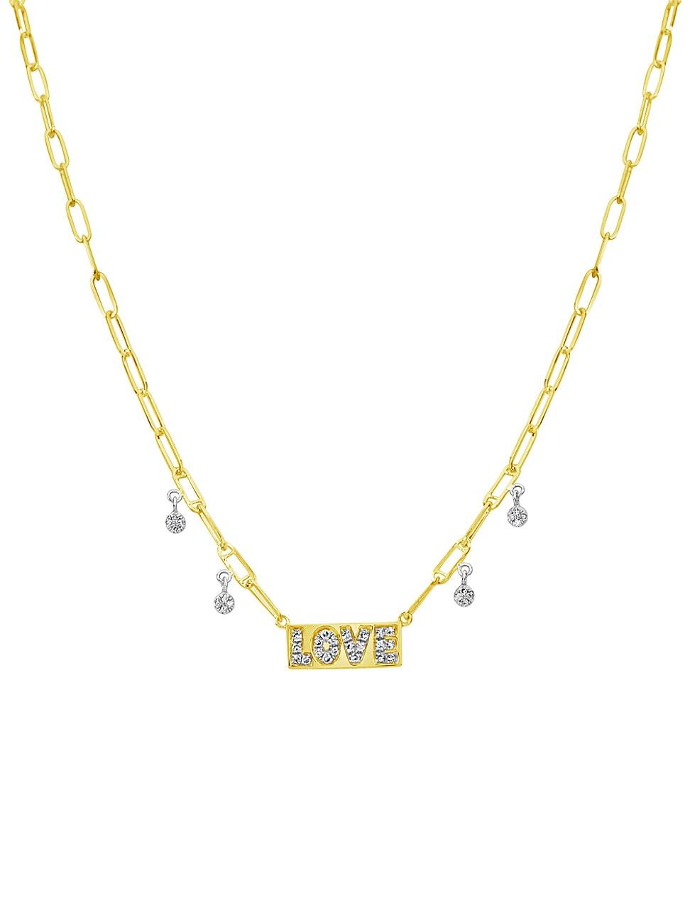 Meira Ts Love Plate necklace is crafted of 14K yellow gold. This sparkling style features a pendant with diamond-encrusted lettering and round charms on a paperclip chain. Diamond,.15 tcw 14K yellow gold Lobster clasp Made in Spain SIZE & FIT Adjustable 18 length Pendant size, about.22 L x.52 W. Fashion Jewelry - Fashion Designer > Meira T > Saks Fifth Avenue > Barneys. Meira T. Color: Yellow Gold.
